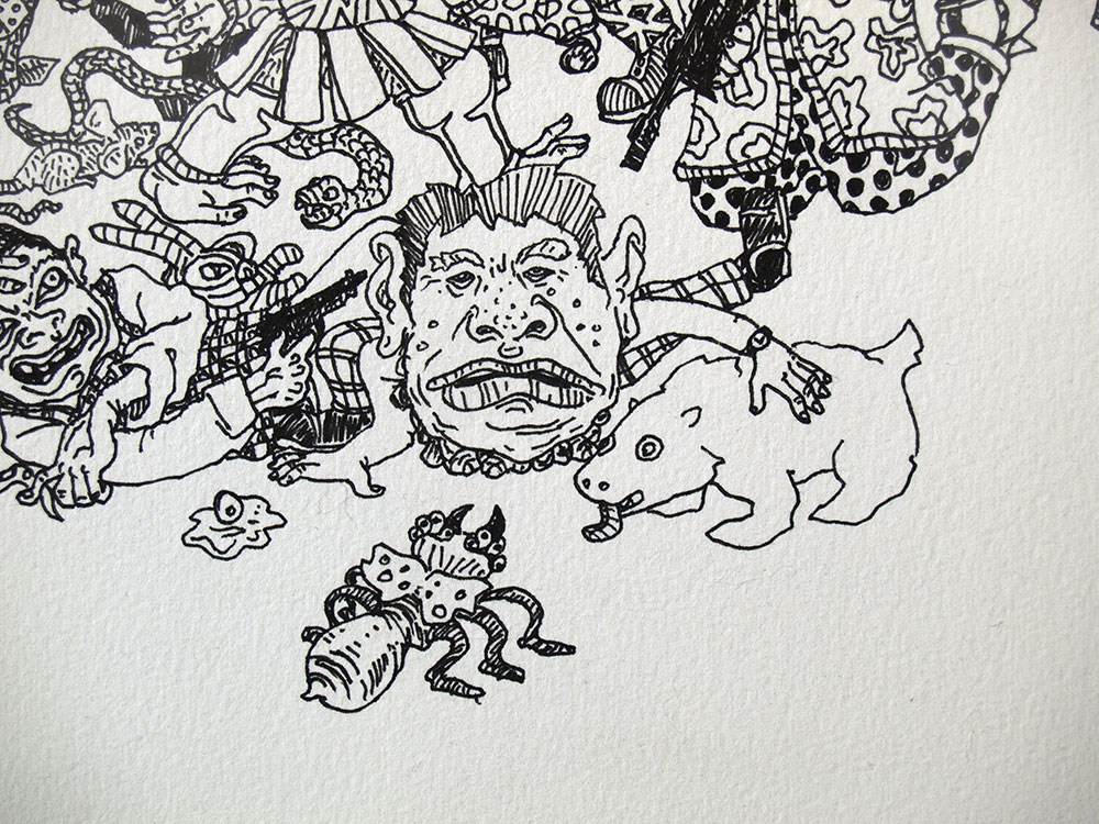 Scroll 3, 2012-2014, ink on paper, detail, 18”x40 feetI call these works "Accretions" because of the organic way in which they are drawn. I impose very little conscious design onto these drawings, allowing the imagery to simply flow from my hand onto the paper. The compositions are organic and fluid. For the last few years, I have primarily been drawing these works on rolls of paper, a form that allows me to see only a few inches of the drawing at a time. I think of them as a kind of exquisite corpse drawn with myself. .